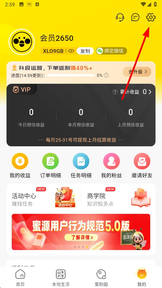 1、打開蜜源app,點擊底部我的圖標進入個人界面后,點擊右上角設置圖標,進入設置頁面,開啟賬號注銷前置流程。