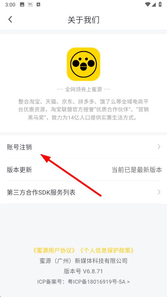 3、進入關于我們界面找到賬號注銷選項,點擊該選項按照提示操作,完成蜜源app賬號注銷流程。
