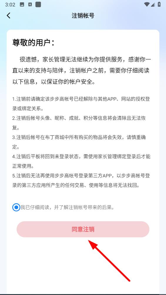 3、仔細閱讀注銷帳號的相關(guān)信息及后果后,勾選我已仔細閱讀,并了解注銷帳號帶來的后果,然后點擊同意注銷。