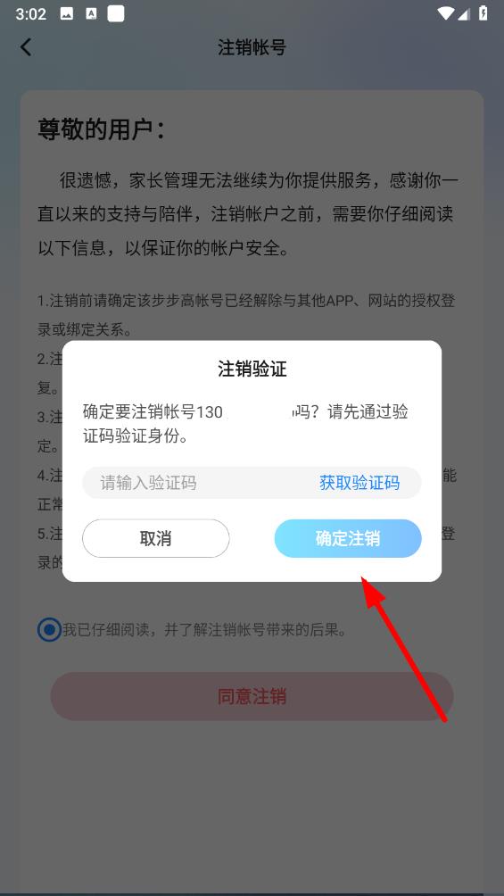 4、在彈出的注銷驗證窗口中,點擊獲取驗證碼,輸入收到的驗證碼,再點擊確定注銷,完成賬號注銷操作。