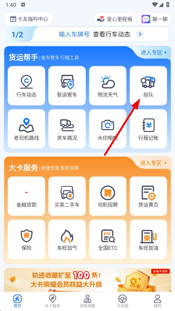 1、打開車旺大卡app,在首頁貨運(yùn)幫手的板塊中,點(diǎn)擊組隊(duì)圖標(biāo)。