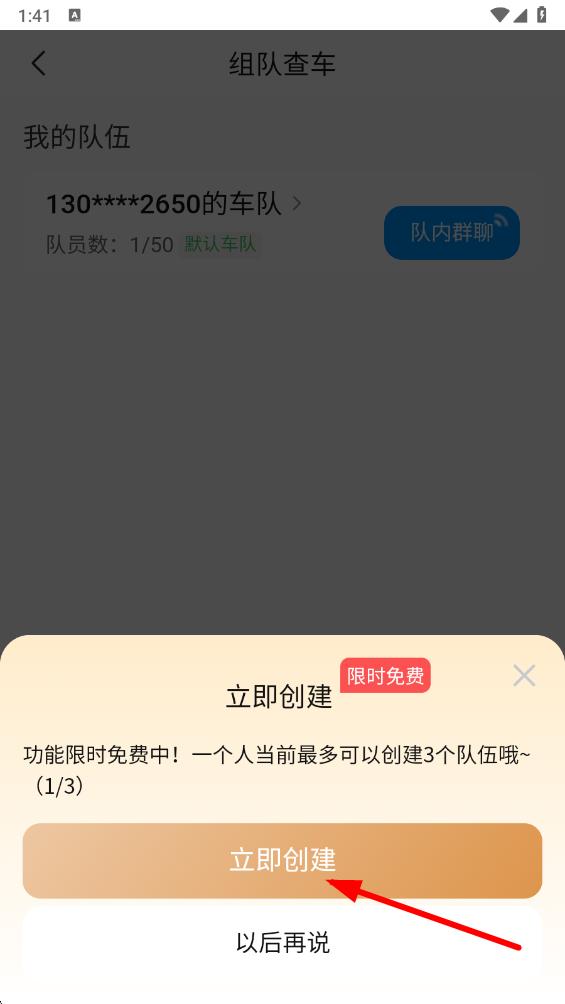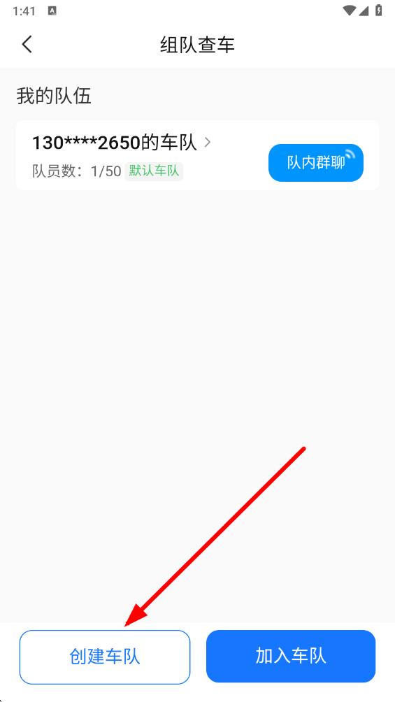 2、進(jìn)入組隊(duì)查車頁面后,點(diǎn)擊下方的創(chuàng)建車隊(duì)按鈕。