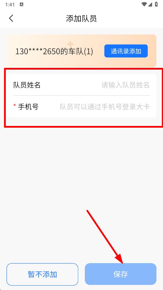 4、進(jìn)入添加隊(duì)員頁面,輸入隊(duì)員姓名和手機(jī)號(hào),確認(rèn)信息無誤后點(diǎn)擊保存,即可完成組隊(duì)查車的車隊(duì)創(chuàng)建和隊(duì)員添加。