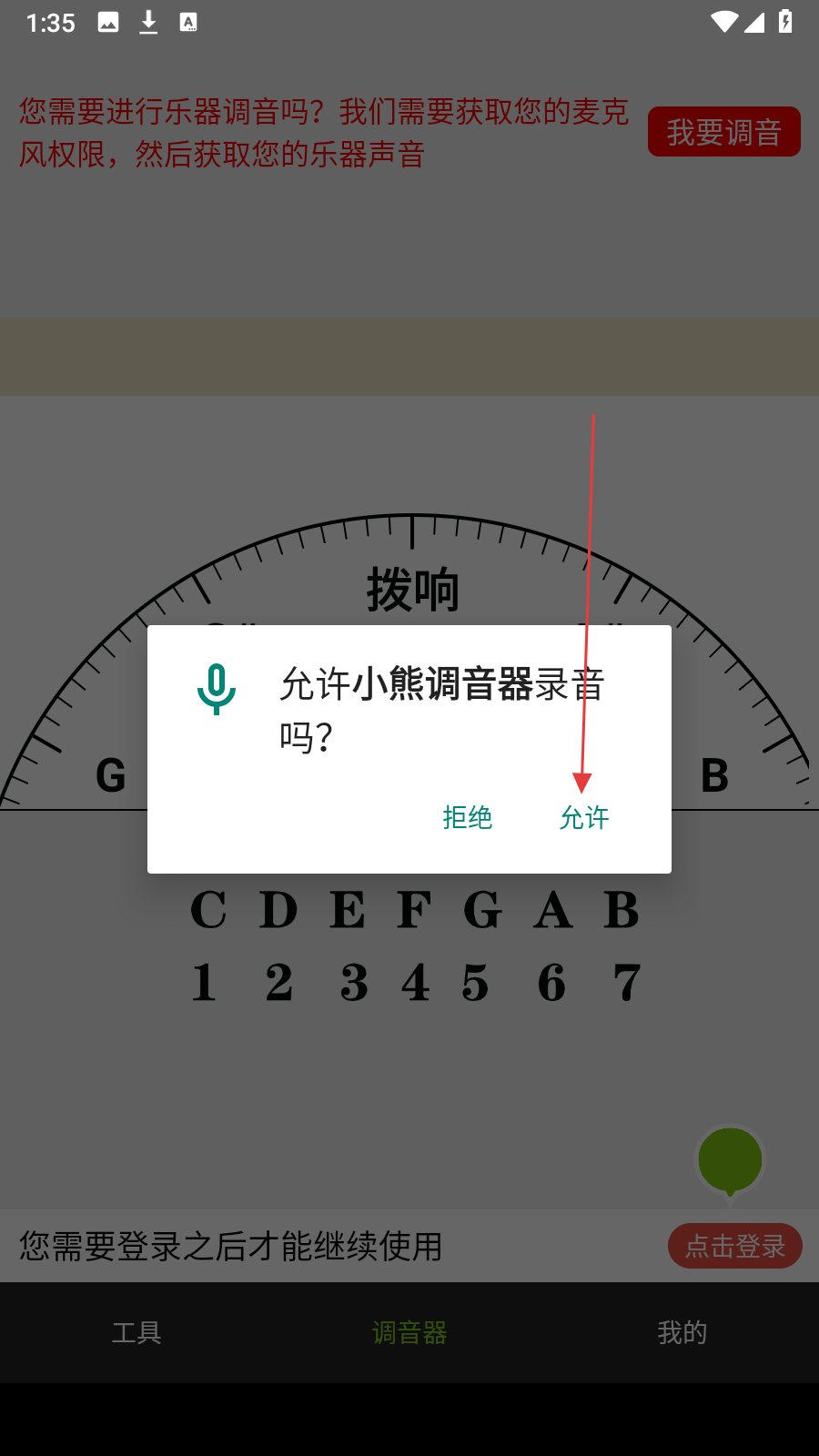2、在彈出的權(quán)限請(qǐng)求窗口中,點(diǎn)擊允許選項(xiàng),授予小熊調(diào)音器錄音權(quán)限。