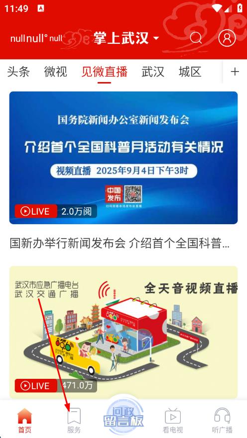 1、打開掌上武漢App,進(jìn)入首頁,點(diǎn)擊底部導(dǎo)航欄中的服務(wù)選項。