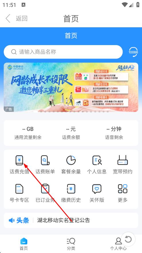 4、點(diǎn)擊電信運(yùn)營商服務(wù)后,在首頁找到話費(fèi)充值選項,點(diǎn)擊進(jìn)入。