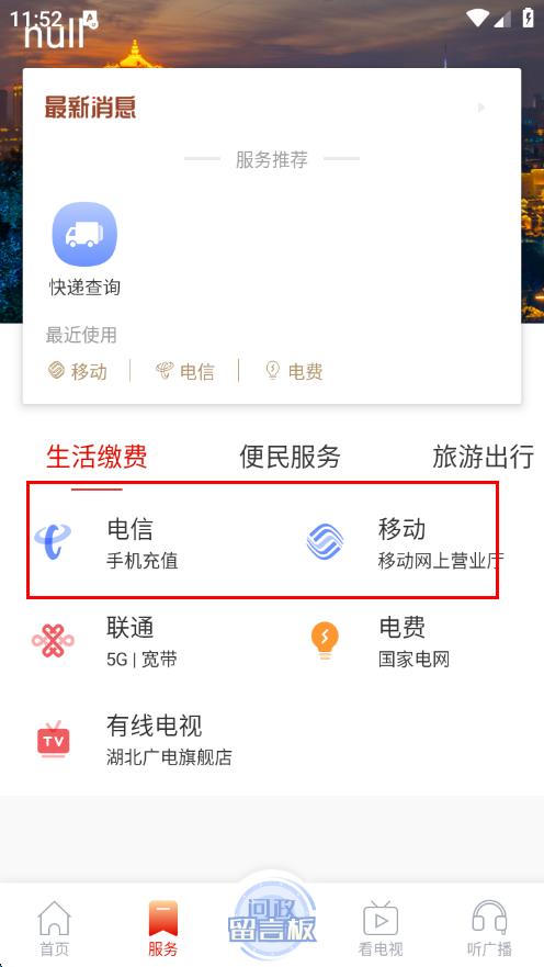 2、在服務(wù)頁面的生活繳費(fèi)板塊,選擇對應(yīng)的運(yùn)營商服務(wù),電信或者移動。