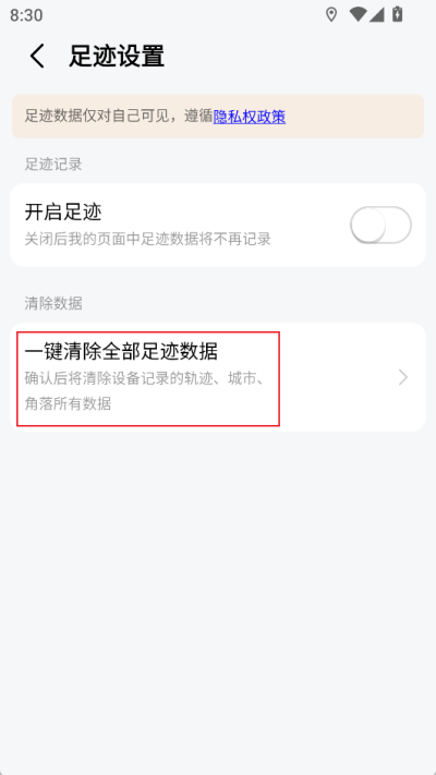 4、在足跡設(shè)置界面,點擊下方【一鍵清除全部足跡數(shù)據(jù)】選項即可將足跡刪除。