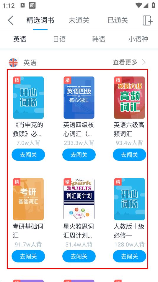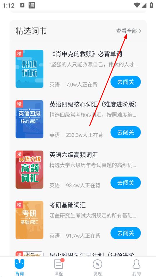 1、打開滬江開心詞場應(yīng)用,在精選詞書區(qū)域,點(diǎn)擊查看全部,可瀏覽更多詞書。