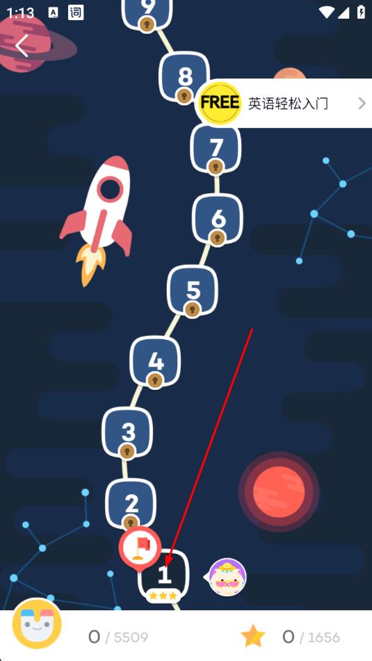 3、選擇想要學(xué)習(xí)的詞書后,進(jìn)入該詞書的關(guān)卡界面,可看到類似火箭軌跡的關(guān)卡排列,點(diǎn)擊目標(biāo)關(guān)卡。