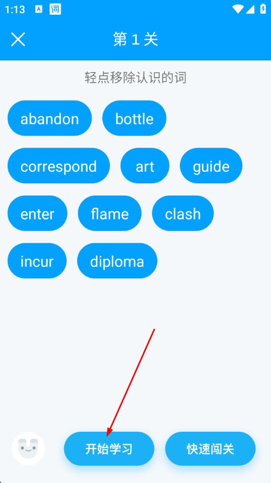 4、進(jìn)入所選關(guān)卡頁面,會展示出該關(guān)卡包含的單詞,可輕點(diǎn)移除認(rèn)識的詞,點(diǎn)擊開始學(xué)習(xí),開啟該關(guān)卡的單詞學(xué)習(xí)。