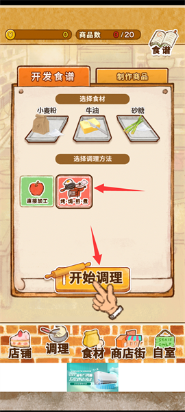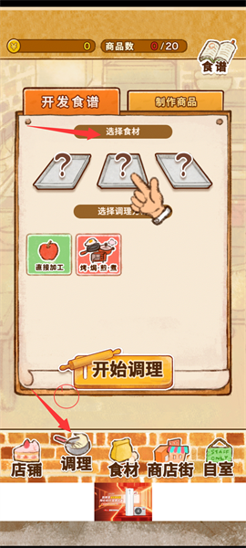 1、首先下載安裝好游戲后,點擊進入,在游戲界面中第一步點擊【調(diào)理】,選擇好我們需要制作的食材,放入盤中;