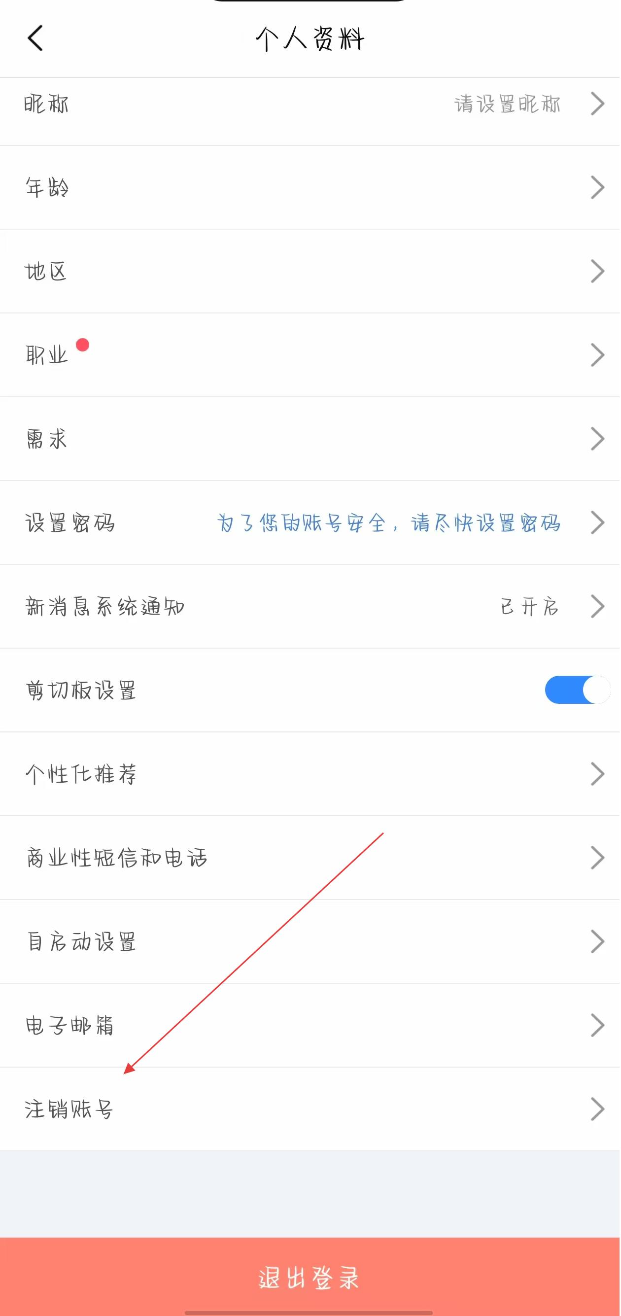 3、在個(gè)人資料界面,找到并點(diǎn)擊注銷賬號(hào)選項(xiàng),進(jìn)入注銷賬號(hào)頁面。