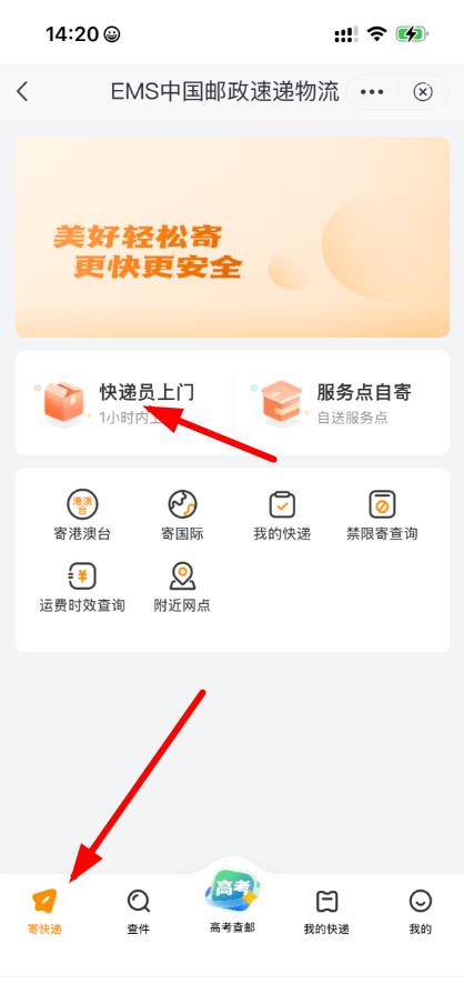 1、打開郵政儲(chǔ)蓄相關(guān)app并進(jìn)入EMS中國(guó)郵政速遞物流界面,點(diǎn)擊底部寄快遞按鈕,再選擇快遞員上門服務(wù)。