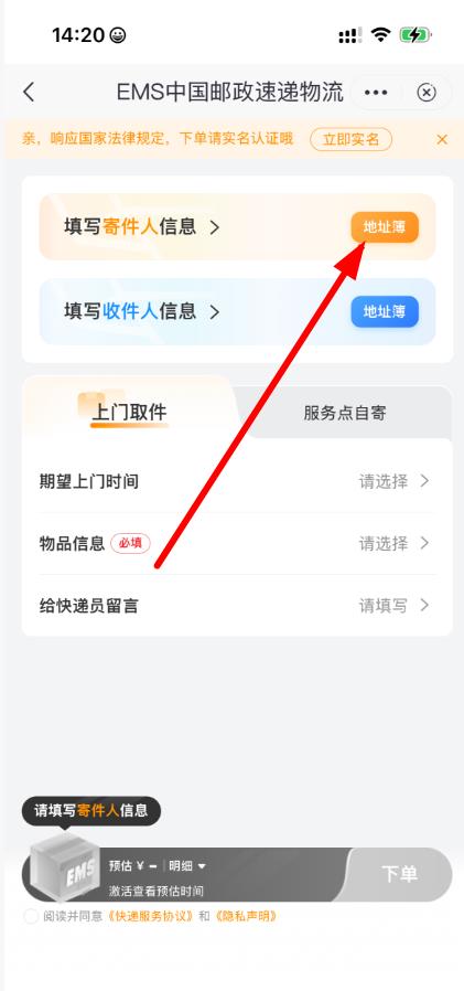 2、在寄件頁(yè)面,點(diǎn)擊填寫寄件人信息旁的地址簿,若地址簿無信息,點(diǎn)擊下方新建地址填寫寄件人地址等信息。