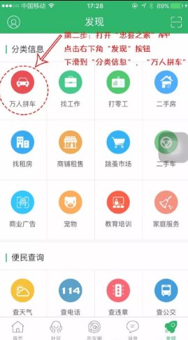 1.打開“忠縣之家”APP點擊“發(fā)現”按鈕,下滑到“分類信息”,找到“萬人拼車”