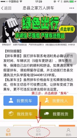 與此同時,沒有下載忠縣之家APP依舊可以通過微信、網頁、qq群等方式發(fā)布和查看忠縣之家萬人拼車平臺上的信息,但無法體驗最新功能!