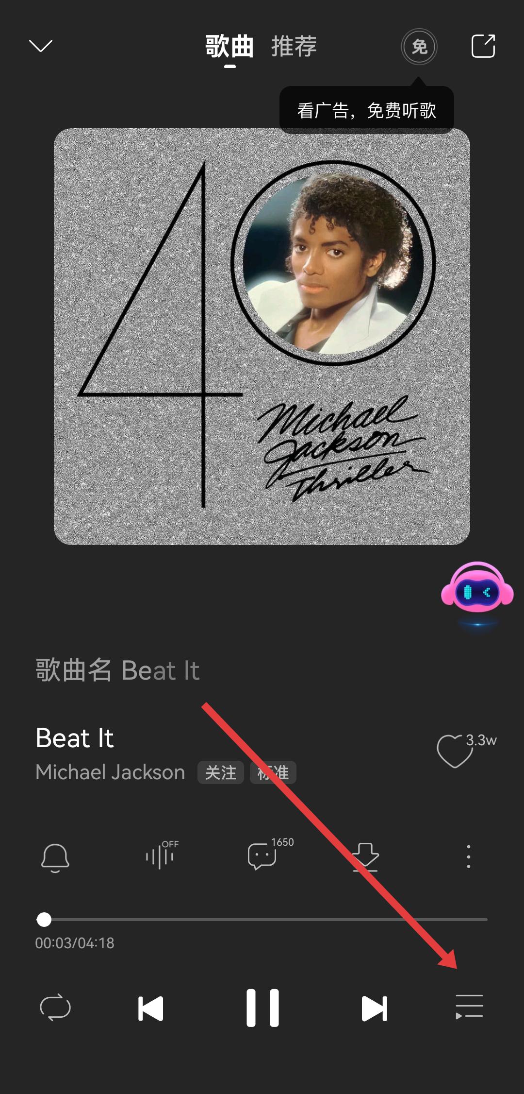 1、打開咪咕音樂APP,進(jìn)入歌曲播放界面后,點(diǎn)擊界面右下角的列表圖標(biāo),調(diào)出功能菜單。