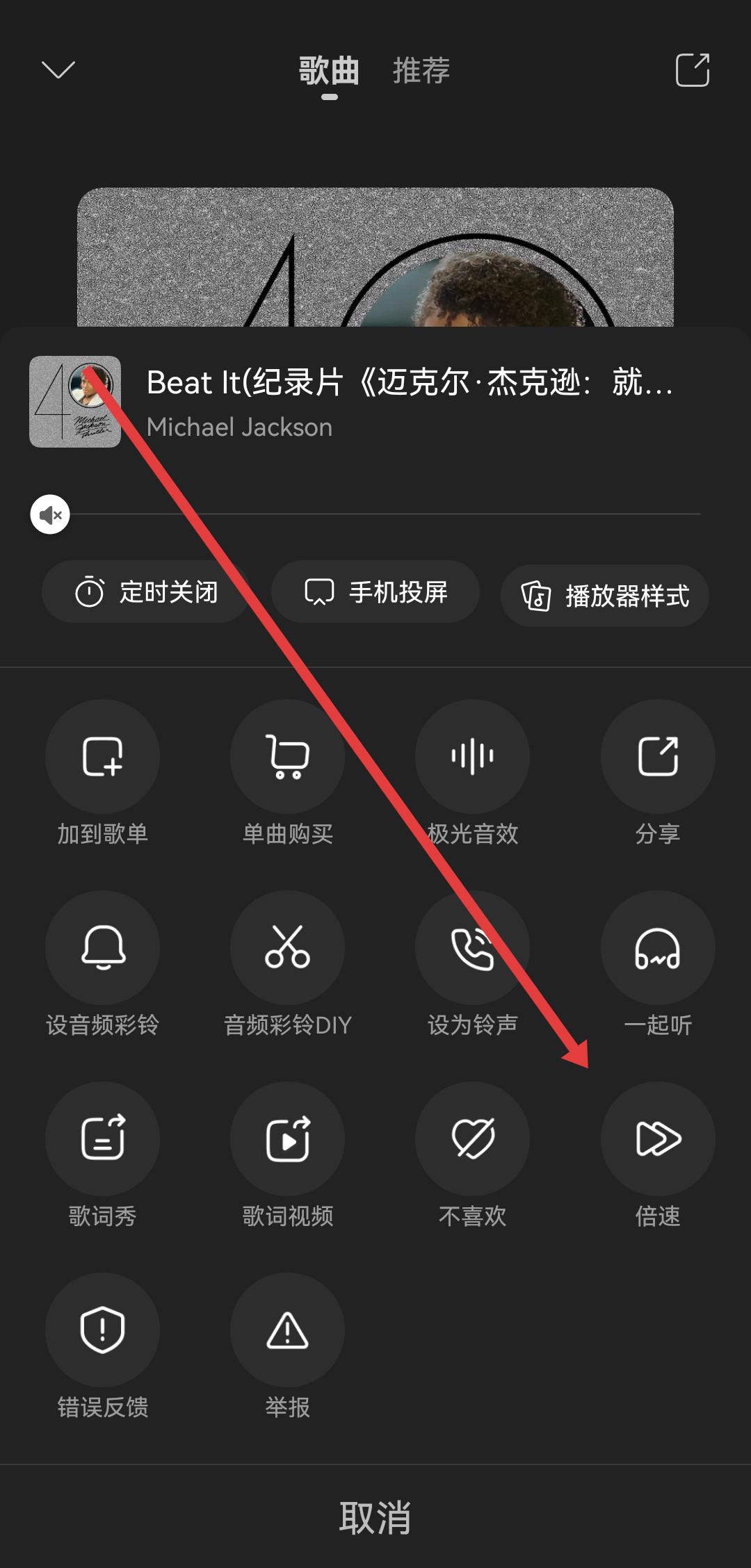 2、在彈出的功能菜單中,需要選擇點(diǎn)擊倍速的選項(xiàng),調(diào)出播放速度的調(diào)節(jié)欄。
