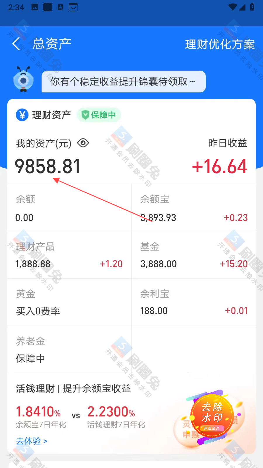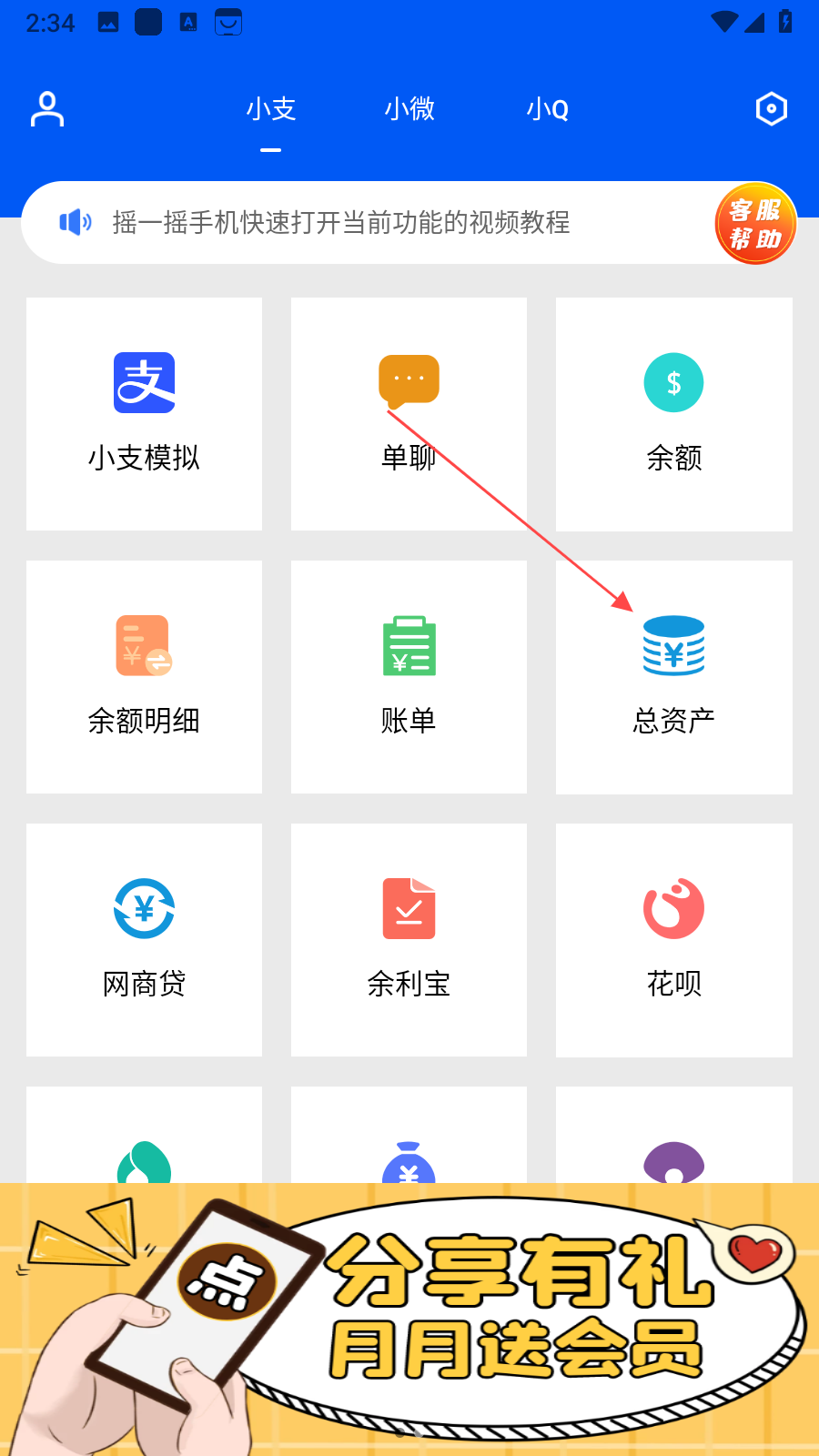 1、打開刷圈兔進(jìn)入小支頁(yè)面,在功能列表里找到總資產(chǎn)選項(xiàng),點(diǎn)擊進(jìn)入總資產(chǎn)模擬界面,可查看默認(rèn)顯示的理財(cái)資產(chǎn)、昨日收益等各類資產(chǎn)數(shù)據(jù)。
