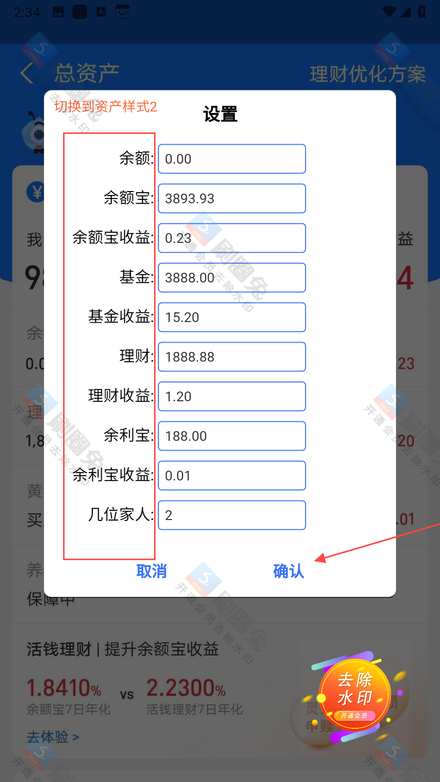 2、在總資產(chǎn)界面點(diǎn)擊右上角設(shè)置圖標(biāo),彈出設(shè)置窗口,在窗口中對(duì)余額、余額寶、基金等各項(xiàng)數(shù)據(jù)進(jìn)行自定義修改,按需填寫數(shù)值。