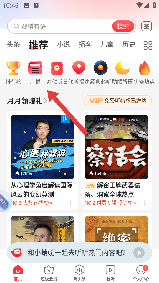 1、打開蜻蜓FM首頁,點(diǎn)擊廣播選項(xiàng),進(jìn)入廣播分類頁面,這里能看到不同地區(qū)、類別的廣播頻道。