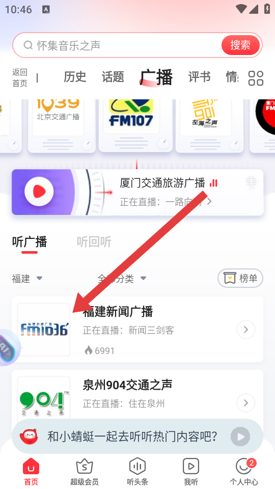 2、在廣播的頁面中,選擇想要收聽的電臺,例如福建新聞廣播,點(diǎn)擊進(jìn)入該電臺的播放界面。