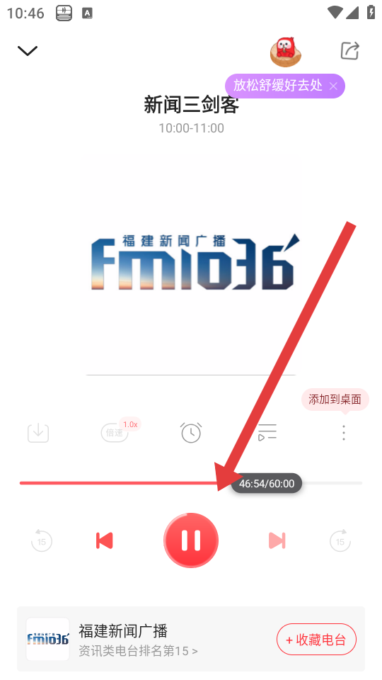 3、進(jìn)入電臺播放界面后,點(diǎn)擊播放控制區(qū)域的按鈕,即可收聽廣播,還可進(jìn)行暫停、調(diào)整播放進(jìn)度等操作。