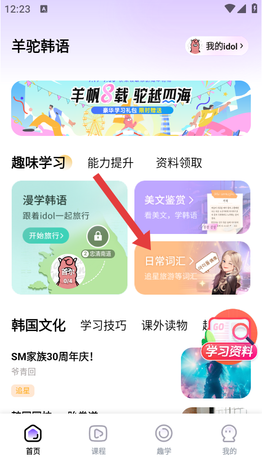 1、在首頁趣味學(xué)習(xí)板塊,點擊日常詞匯,進入詞匯學(xué)習(xí)分類頁面。