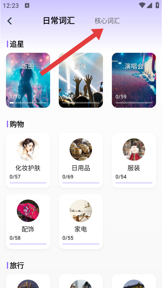 2、在日常詞匯的頁面,點擊核心詞匯,切換至核心詞匯的板塊。