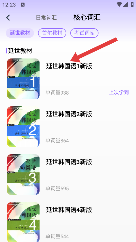 3、在教材分類中,選擇延世韓國語1新版,進入對應(yīng)教材的詞匯列表頁面。