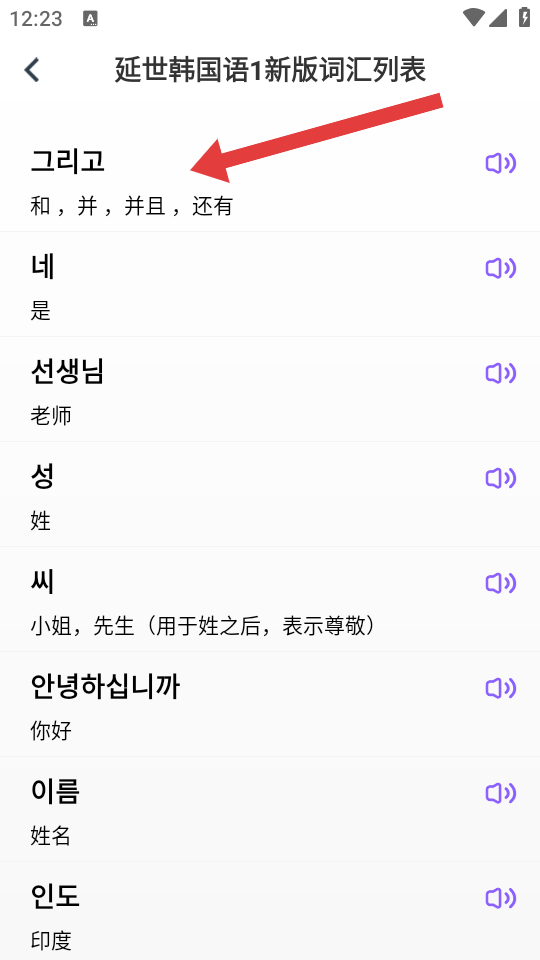 4、進入延世韓國語1新版詞匯列表后,可學(xué)習(xí)具體單詞如???等。