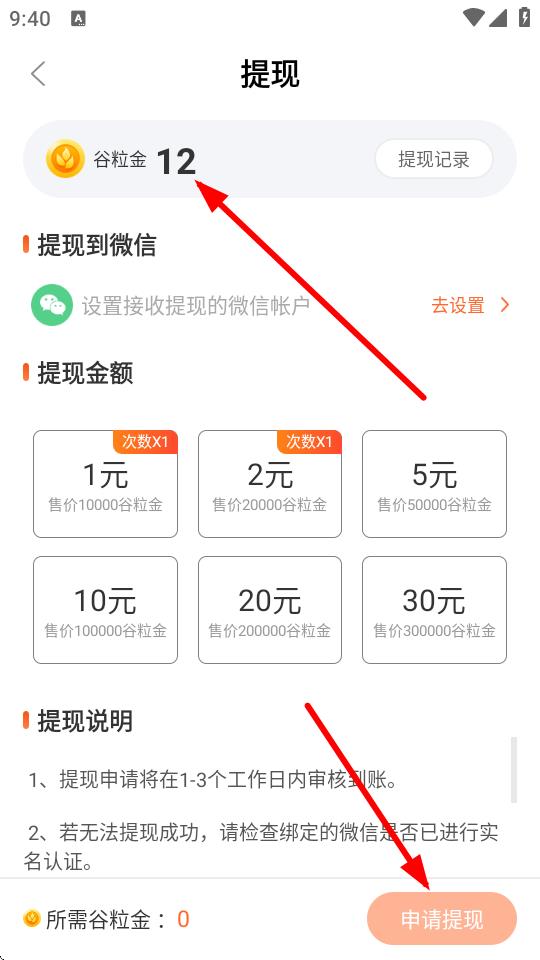 4、設(shè)置好接收提現(xiàn)的微信賬戶,選擇提現(xiàn)金額并點(diǎn)擊申請?zhí)岈F(xiàn),即可將谷粒金兌換為現(xiàn)金。