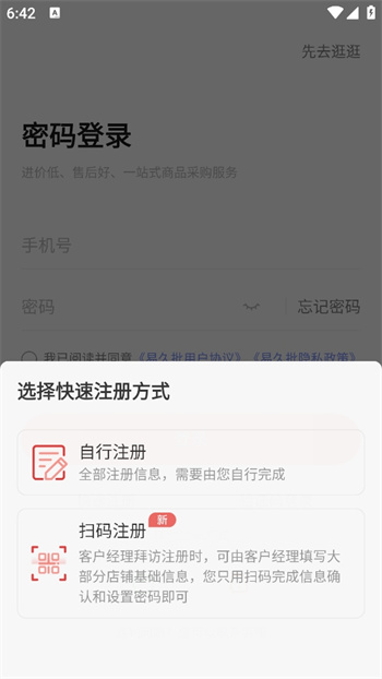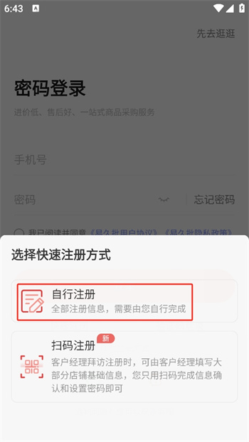 4、如果沒有賬號的可以點擊下方的【快速注冊】,在這里選擇一個注冊的方式,跟隨著自己的情況進行【自行注冊】與【掃碼注冊】兩種情況的選擇;