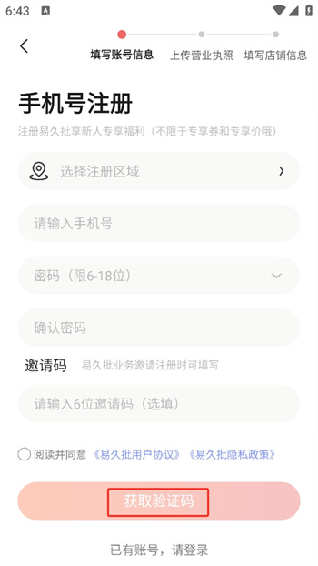 5、小編選擇第一個為例進入注冊操作中,選擇注冊賬號的區(qū)域,還有手機號、密碼、邀請碼獲取驗證碼之后,就可以完成賬號的注冊操作了。