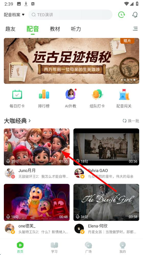 1、打開英語趣配音app進(jìn)入首頁后,點(diǎn)擊想要發(fā)現(xiàn)的視頻,進(jìn)入該作品的播放頁面。