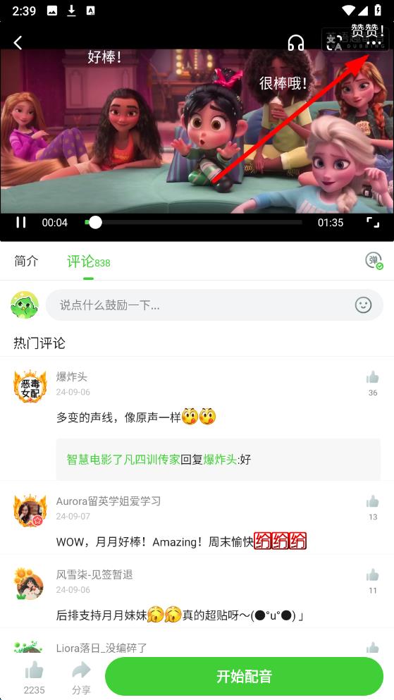 2、在配音作品播放頁面中,點(diǎn)擊右上角的三點(diǎn)圖標(biāo)會(huì)彈出包含多種操作選項(xiàng)的菜單。