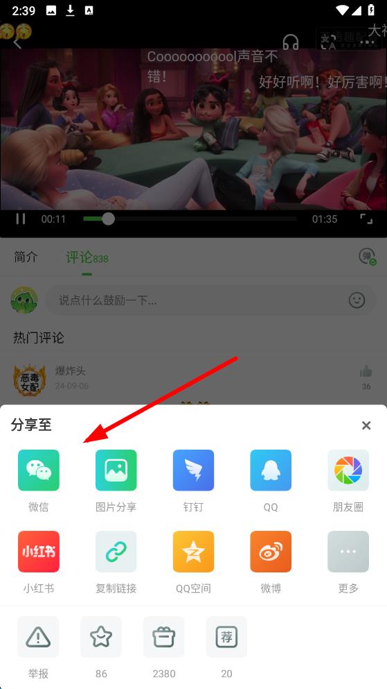 3、在彈出的菜單里在出現(xiàn)的分享渠道中選擇微信,按照提示操作即可將英語趣配音作品分享到微信。