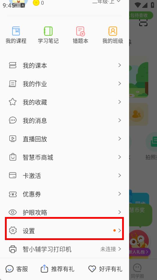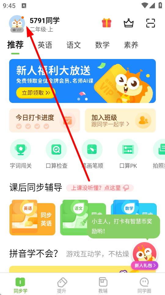 1、打開冀教app小學版,點擊左上角頭像位置,進入個人功能菜單界面。