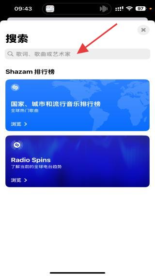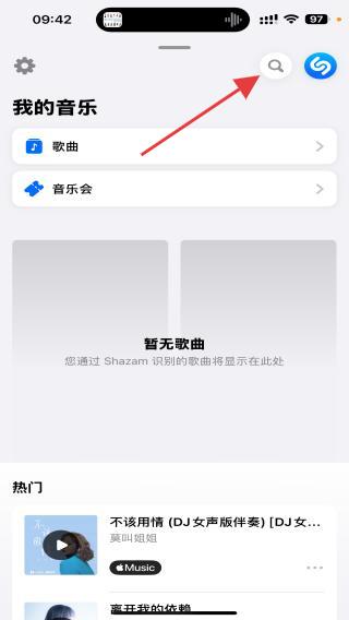 1、打開Shazam應(yīng)用,進(jìn)入到首頁,點(diǎn)擊右上角搜索的圖標(biāo)。