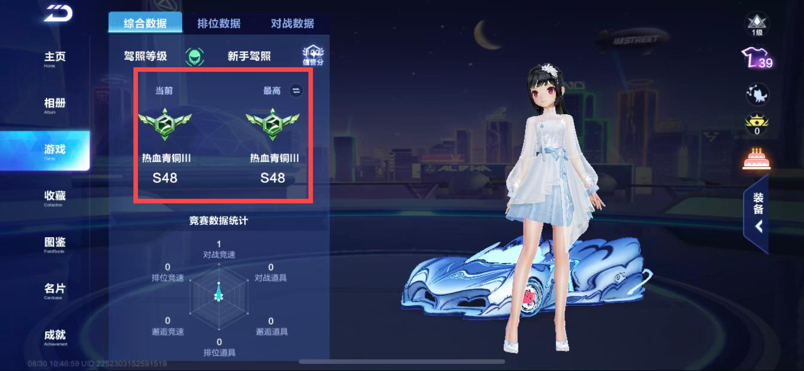 3、在綜合數(shù)據(jù)欄目下,查看當(dāng)前和最高的排位段位信息,會(huì)顯示具體段位圖標(biāo)與名稱,如熱血青銅Ⅲ等。