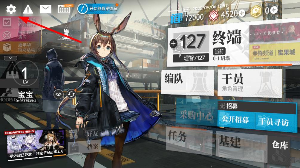 1、打開(kāi)明日方舟游戲,點(diǎn)擊游戲主界面左上角的設(shè)置圖標(biāo)進(jìn)入設(shè)置界面。
