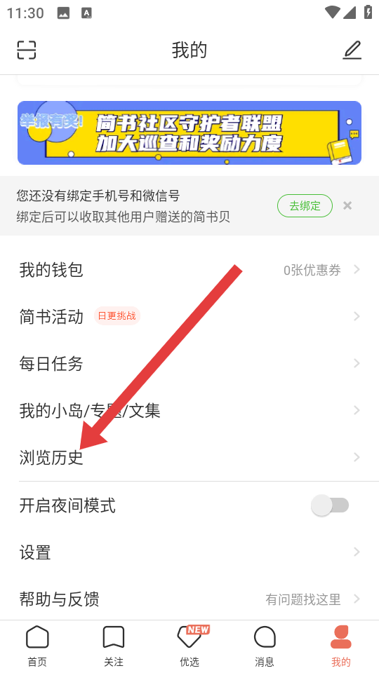 1、在簡(jiǎn)書我的頁面,點(diǎn)擊瀏覽歷史的選項(xiàng),進(jìn)入瀏覽歷史界面。