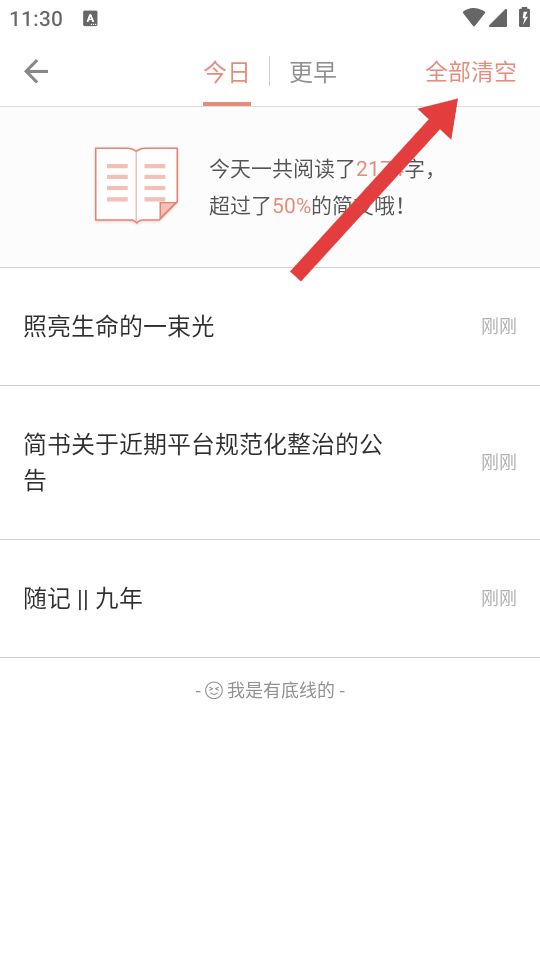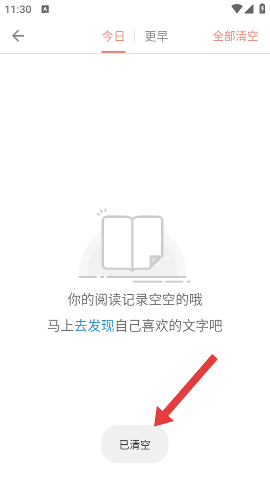 4、界面顯示已清空提示,且區(qū)域變?yōu)槟愕拈喿x記錄空空的哦,即成功刪除瀏覽記錄。