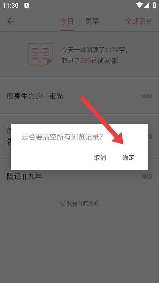 3、在是否要清空所有瀏覽記錄的確認(rèn)彈窗中,點(diǎn)擊確定按鈕,確認(rèn)清空。