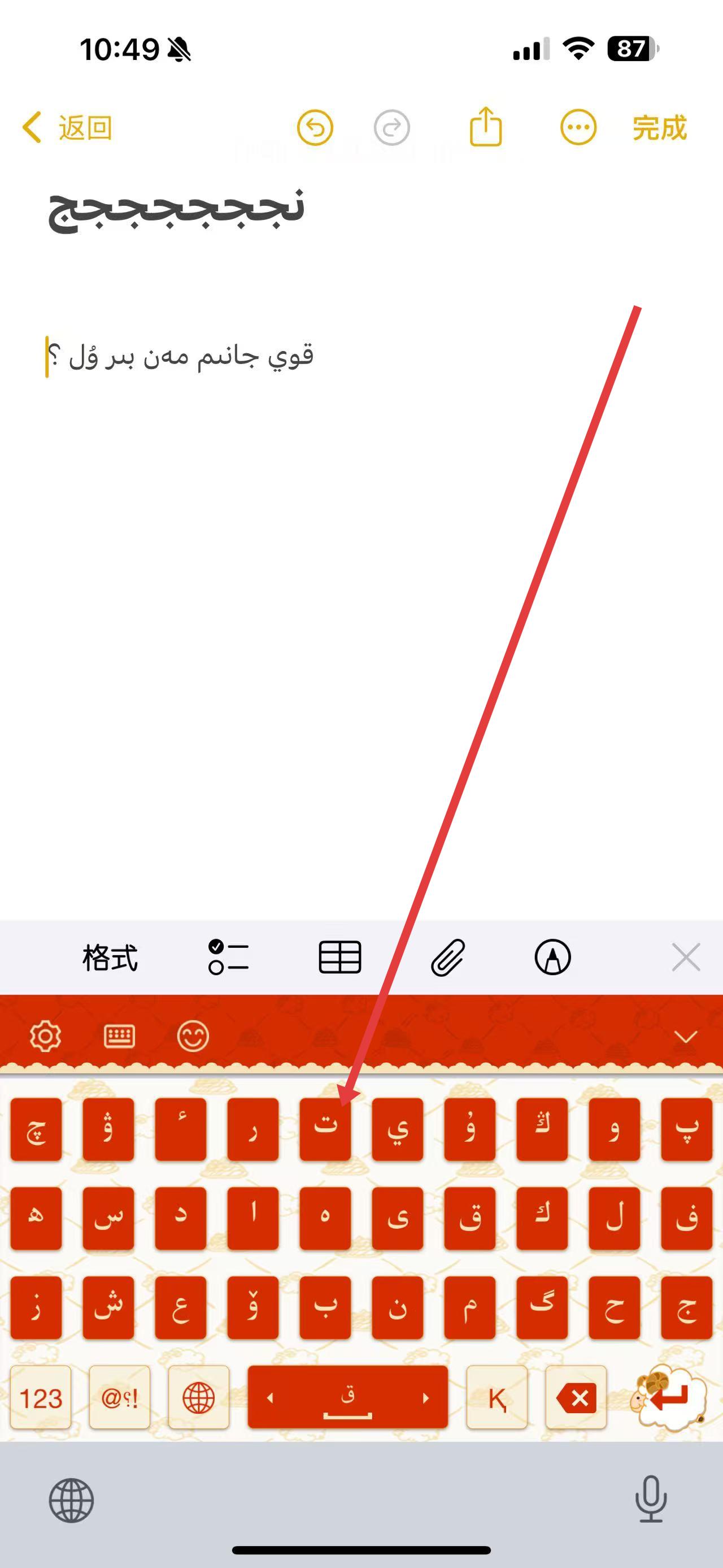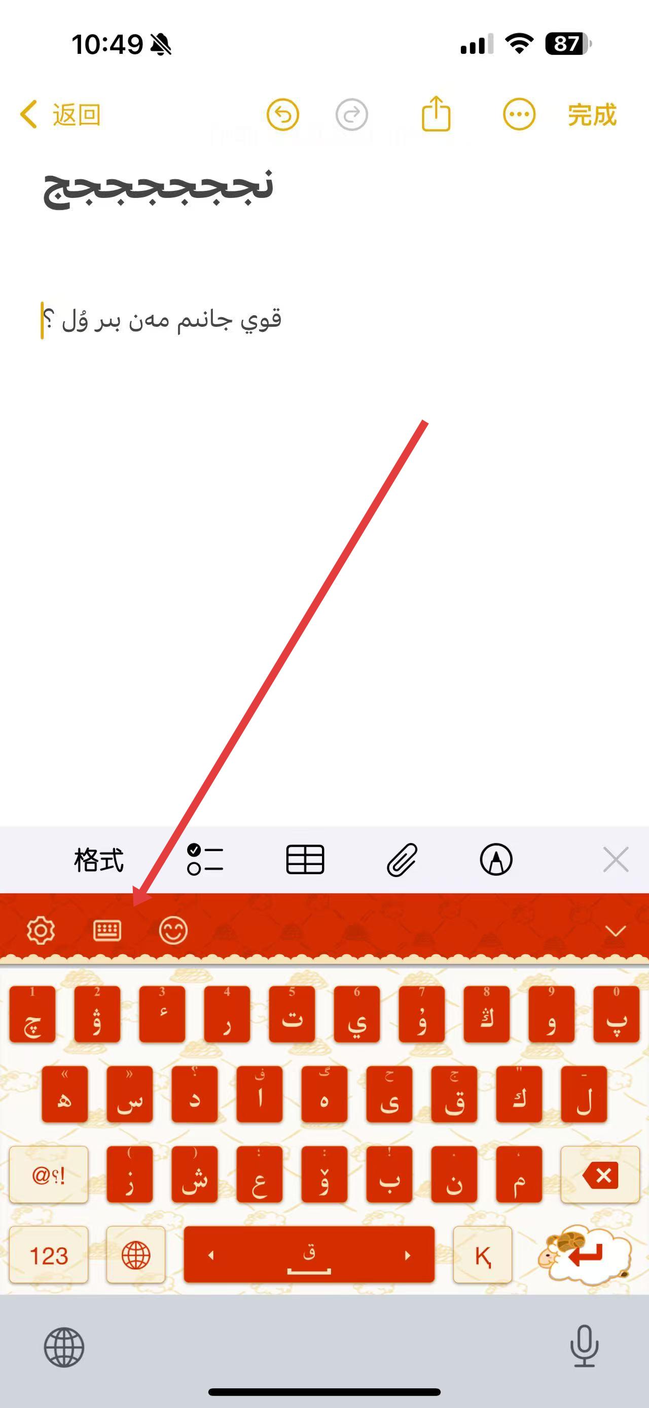 3、在紅色鍵盤界面,點擊箭頭指向的?按鍵,輸入對應(yīng)字符,完成文字錄入操作。