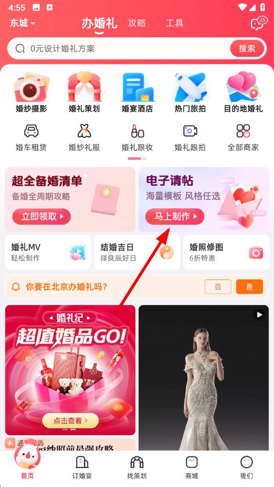 1、打開婚禮紀(jì)App進(jìn)入首頁點(diǎn)擊電子請(qǐng)?zhí)鍓K中的馬上制作按鈕,進(jìn)入請(qǐng)?zhí)谱鬟x擇頁面。