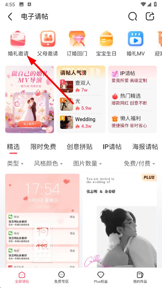 2、在請(qǐng)?zhí)谱鬟x擇頁面中點(diǎn)擊婚禮邀請(qǐng)的選項(xiàng)卡,瀏覽各種婚禮邀請(qǐng)函模板。