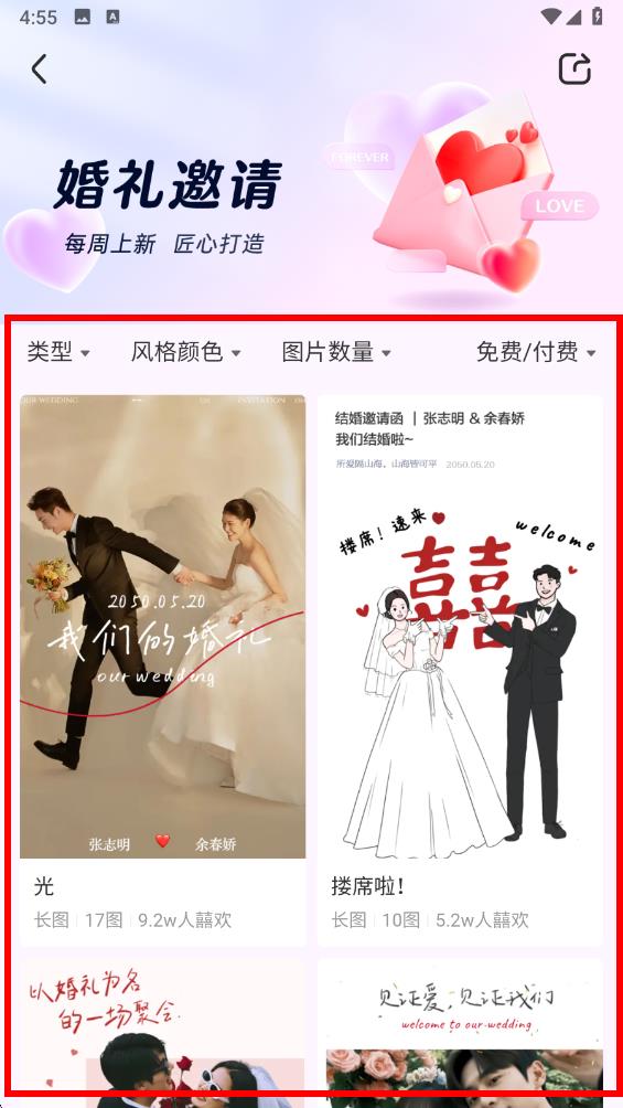 3、根據(jù)喜好從展示的眾多婚禮邀請(qǐng)函模板中挑選心儀的模板,可依據(jù)類型、風(fēng)格顏色、圖片數(shù)量、免費(fèi)付費(fèi)等條件篩選。