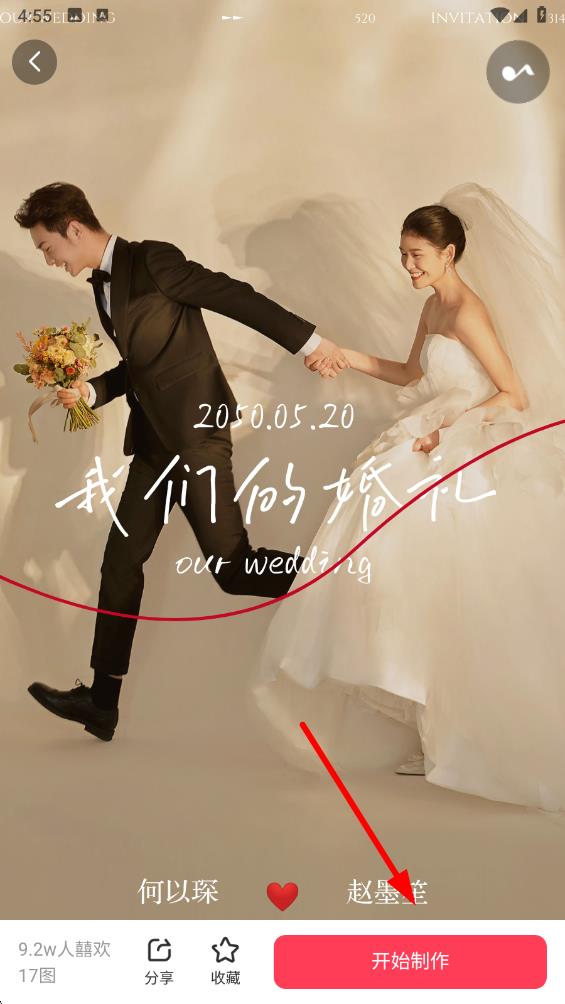 4、點(diǎn)擊選中模板下方的開始制作按鈕,進(jìn)入編輯界面,按照提示上傳照片、修改文字等信息,完成后即可生成專屬婚禮邀請(qǐng)函。